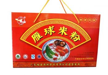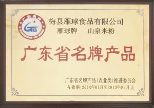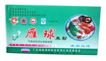 本公司生產的雁球牌米排粉,采用優質大米、高山天然山泉水,經科學配制,嚴格的衛生條件里精制而成。該產品有營養豐富,口感滑爽,食用方便,能蒸、能泡、能炒等特點,既能做成各種花式的美餐,同時還便于保存,久不變質。該產品除滿足梅州地區外,還遠銷廣州、深圳、江西、福建等地,特別是海外華同胞品嘗了雁球牌米排粉后,更是交口稱贊。雁球牌米排粉在2001年被國家產品質量保障中心和國家名優產品認定中心授予“中國名優產品”,2002年被國家中輕產品質量保障中心授予“消費者滿意產品證書”。同時公司早在1999年就被國家農業部授予“全面質量管理達標證書”。公司連續多年被市、縣評為文明單位,2003年被梅州市政府授予連續五年“重合同守信用企業”。